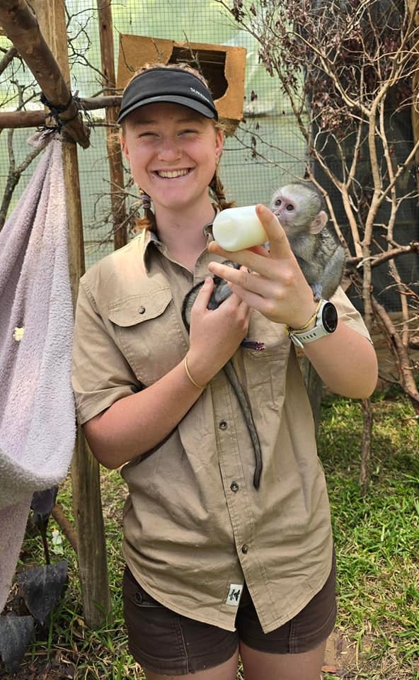 Volunteer Stef has her hands full with these orphaned vervet monkeys.