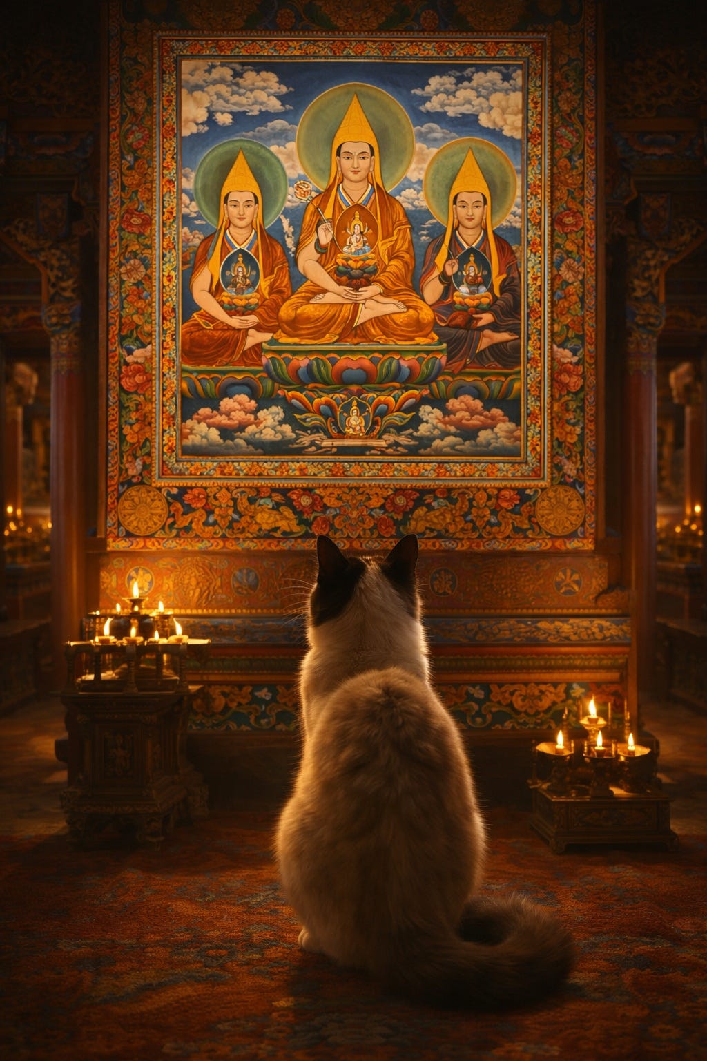 Amid their congratulations, I allowed my gaze to drift towards the Tsongkhapa thangka upon the wall. There they were: Chenrezig at the heart. Manjushri at the mind. Vajrapani in the hand that acts.