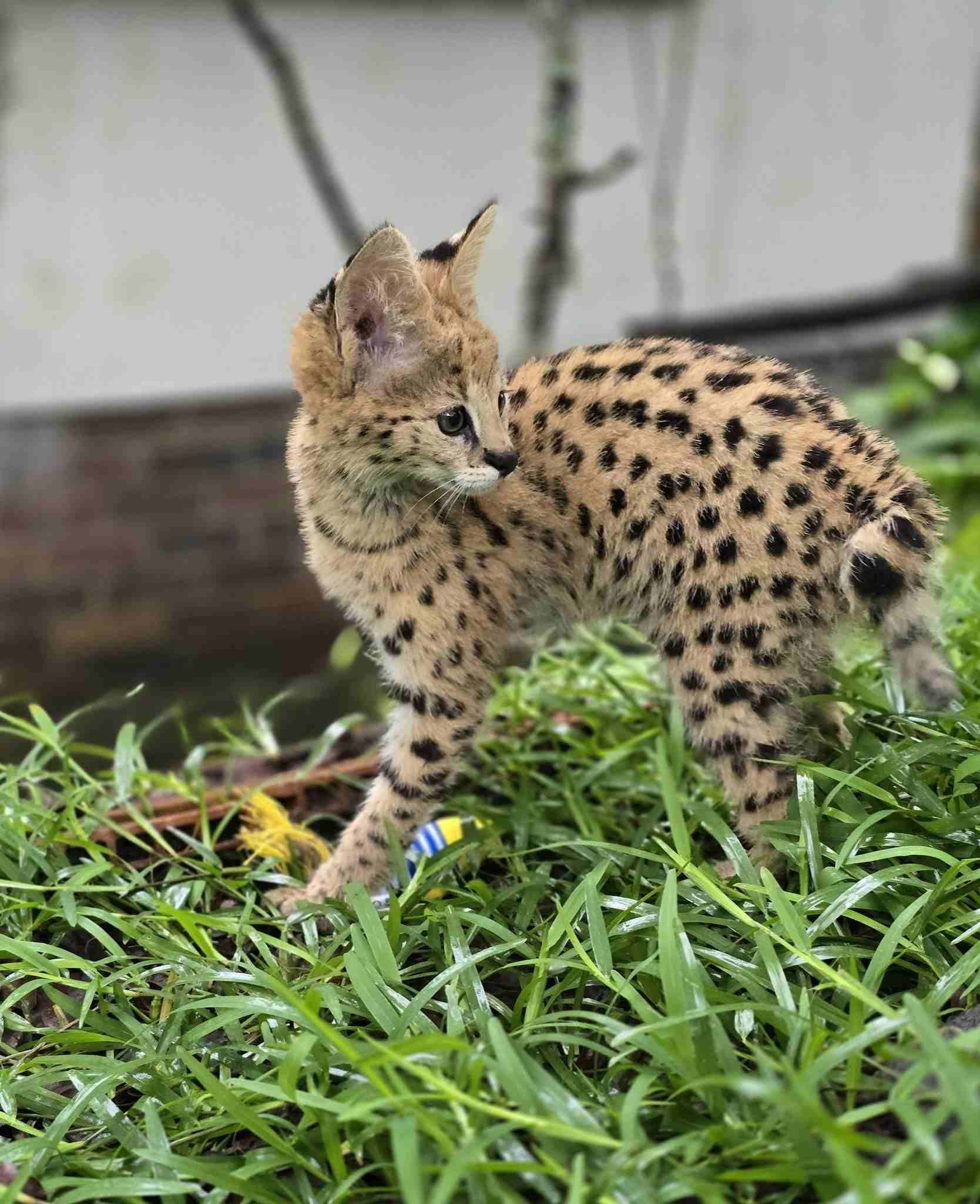 Photo: Sylvie the serval happily plays in the rain. Servals have wonderful thick coats to keep them dry and warm. You can see her broken tail from where she was caught by dogs on a farm.”