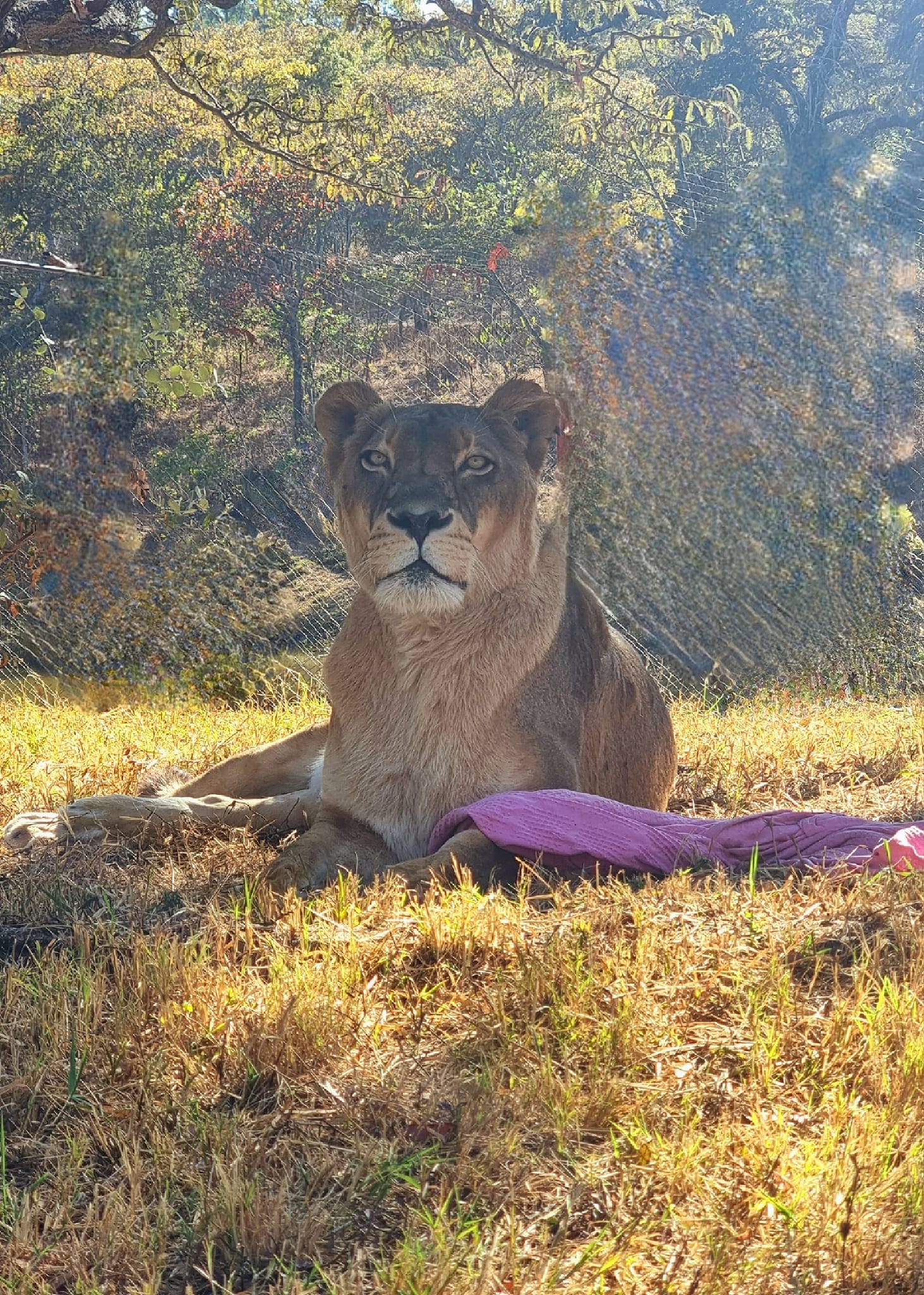 Sarah and Vinay weren’t sure what the best living arrangements for her would be. She couldn’t be returned to the wild, having had no lion family to learn from, and having had humans and our ways imprinted strongly on her consciousness. When she arrived, for example, she was delivered with a favourite blanket, and a ‘comfort blanket’ has remained a firm favourite of hers ever since.