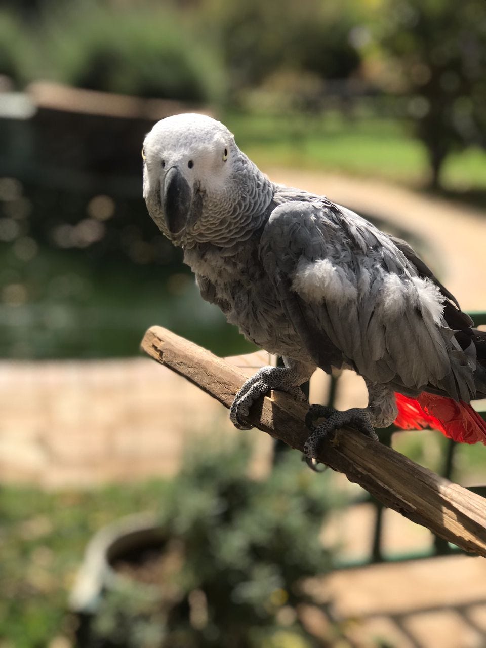 Months later, her chest is still fairly bald, but there has been regrowth, and from having arrived completely mute, she has started, once again, to vocalise a little. She was sitting not far from a male African Grey Jinky when I stepped into the aviary. As I approached to say hello, the male parrot quickly sidled up to her. It was a possessive motion and she seemed quite receptive to him. Which made me happy for her. Love can take so many forms. Perhaps she will have a second chance at it – this time with a feathered companion instead of her previous human one.