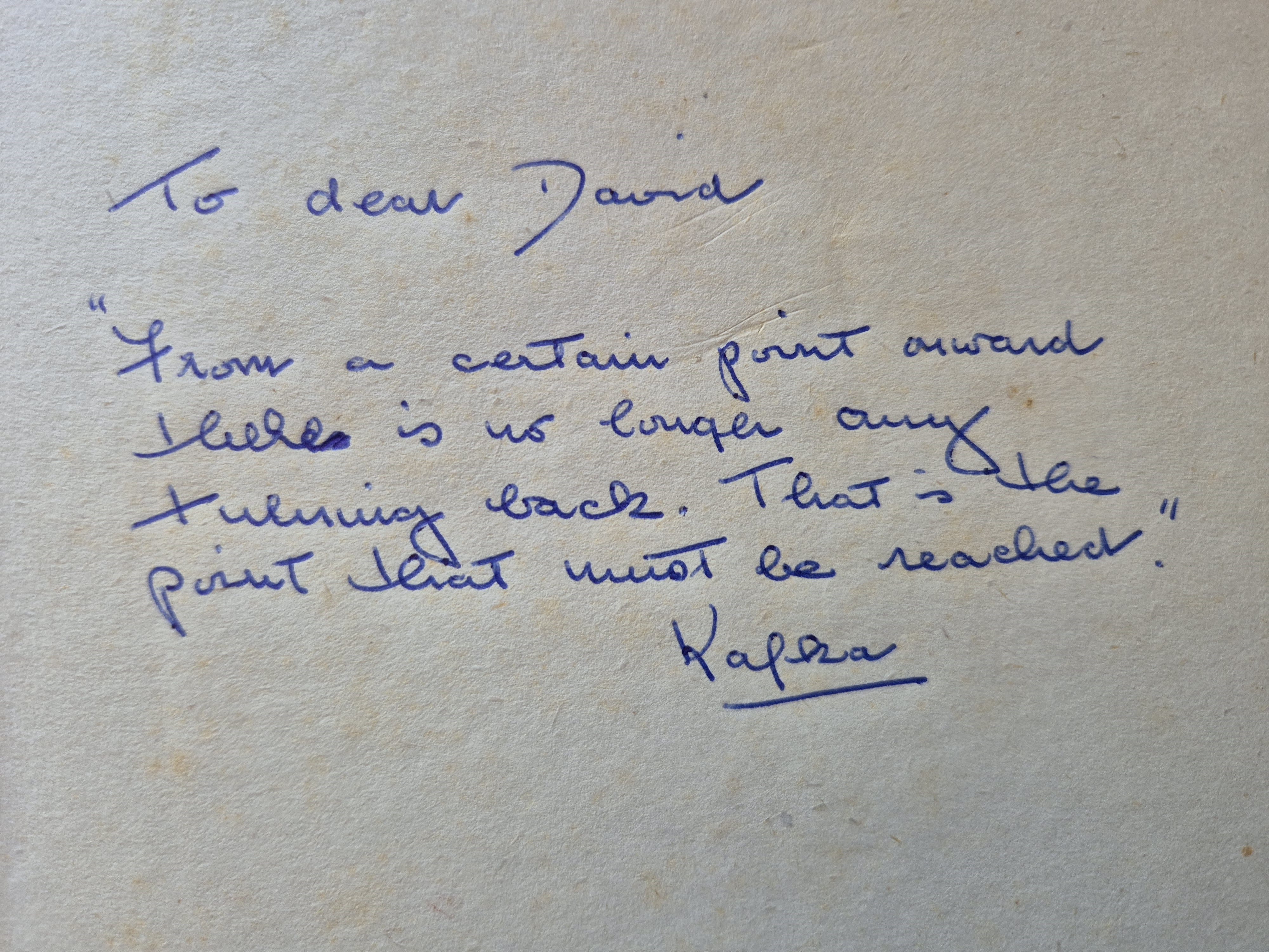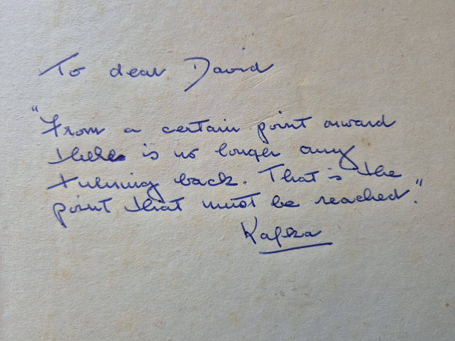 The day came that Kay decided that she was getting too old for her remote, Juliasdale cottage. Instead, she planned spending southern hemisphere summers with close friends in Natal, South Africa. With typical generosity, she offered me many of her Juliasdale book collection, which I gladly accepted. In a few of the more handsome hardbacks, she went to the trouble of writing a favourite aphorism at the front that, for whatever reason, seemed appropriate.