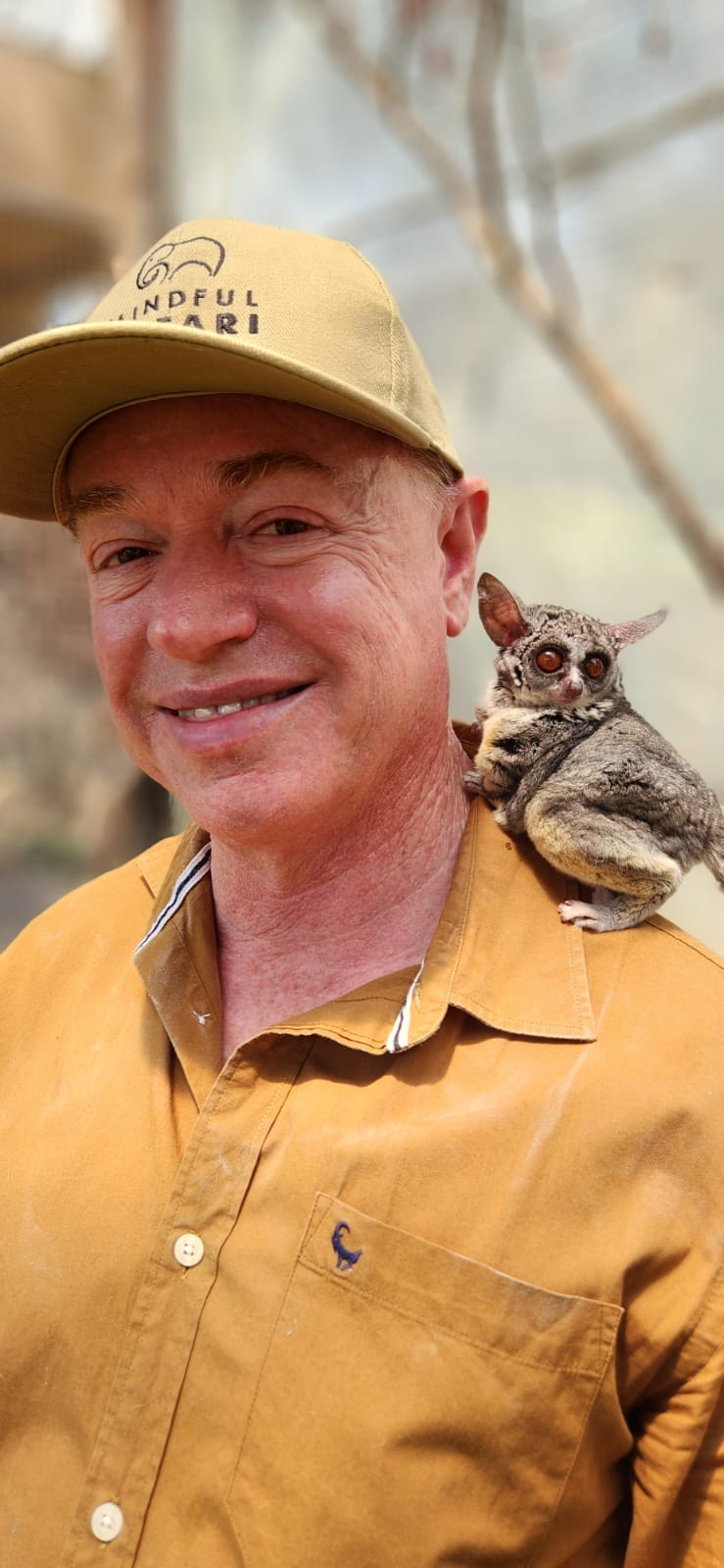 With Rhonda the night ape (Galago) at Twala Trust Animal Sanctuary